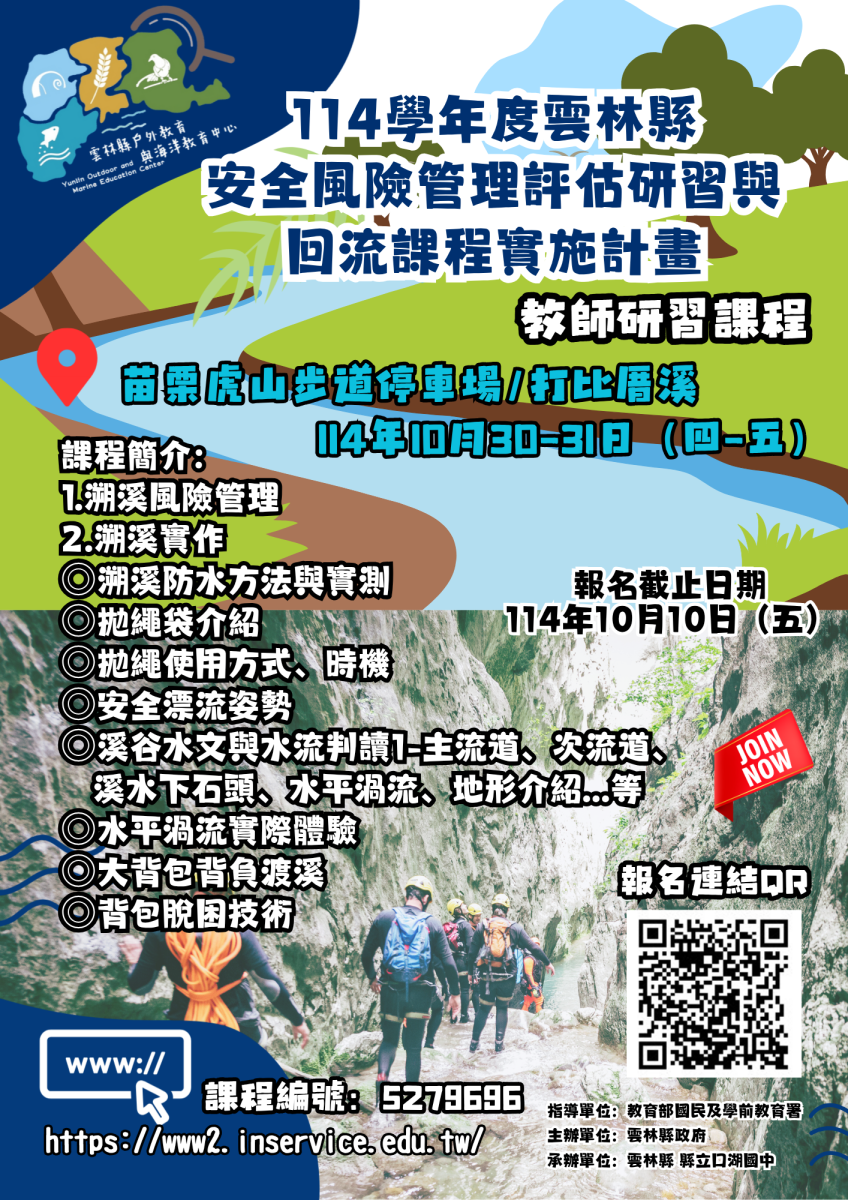 為推廣戶外與水域教育理念,並提升教師安全意識與專業知能,於 10/30(四)-10/31(五) 辦理 「安全風險管理評估研習課程」! 課程特色 溯溪風險辨識 × 裝備操作 × 規劃實務 打比厝溪戶外實作 × 安全漂流 × 跳水技巧 專業講師帶領,小組探究體驗,素養導向課程 地點:苗栗虎山步道停車場/打比厝溪 日期:114年10月30-31日 對象:教師(全程參與可核發研習時數17小時並取得 Level 1 溯溪訓練證書) 報名方式: 9/28 起請至「全國教師在職進修網」報名,截止日為 10/10(五)! 聯絡窗口:口湖國中 吳靜欣 主任 (05)6341295 #031 | star03301983@msn.com 讓我們一起培養正確態度與風險管理能力,把戶外教育做得更安全、更專業! #雲林戶外教育及海洋教育 #安全風險管理 #溯溪體驗 #教師研習